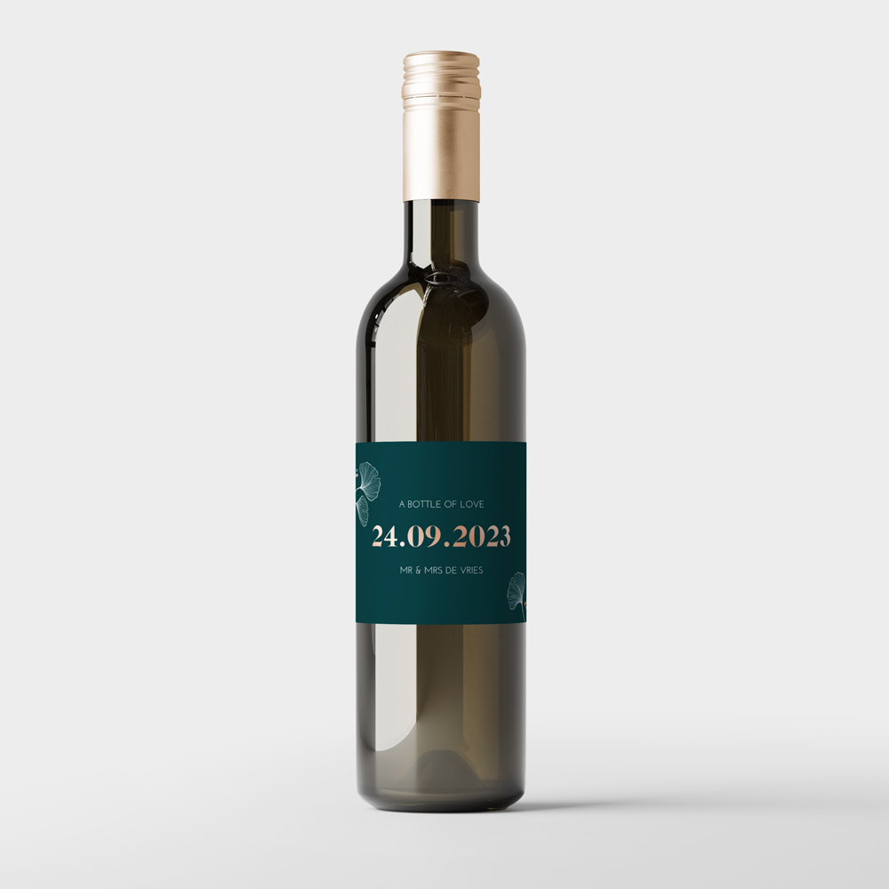 Wijnetiket voor op een fles als bedankje aan de gasten van jullie bruiloft. Formaat: liggend 11x8 cm. Dit etiket hoort bij de trouwhuisstijl Ginkgo green.
