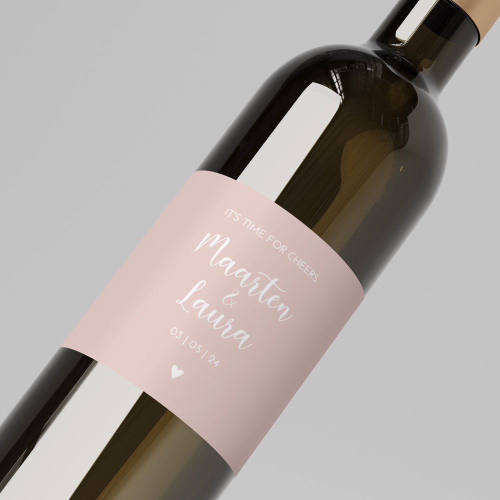 Wijnetiket voor op een fles als bedankje aan de gasten van jullie bruiloft. Formaat: liggend 11x8 cm. Dit etiket hoort bij de trouwhuisstijl Romantic Peach.