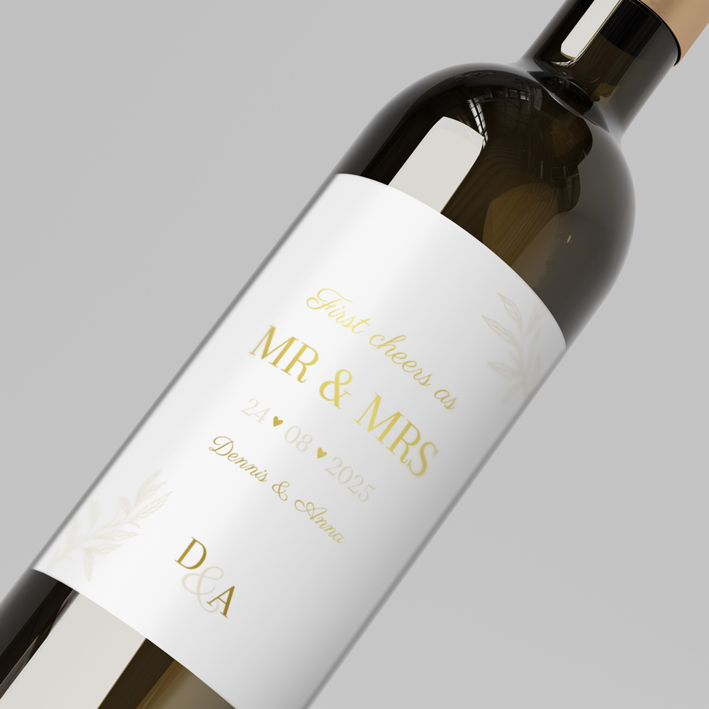 Wijnetiket voor op een fles als bedankje aan de gasten van jullie bruiloft. Formaat: staand 8x11 cm. Dit etiket hoort bij de trouwhuisstijl Classic love.
