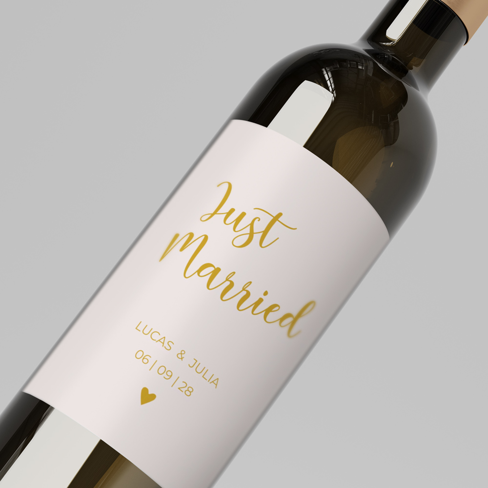 Wijnetiket voor op een fles als bedankje aan de gasten van jullie bruiloft. Formaat: staand 8x11 cm. Dit etiket hoort bij de trouwhuisstijl Golden lettering.• Ontwerp je eigen wijnetiket