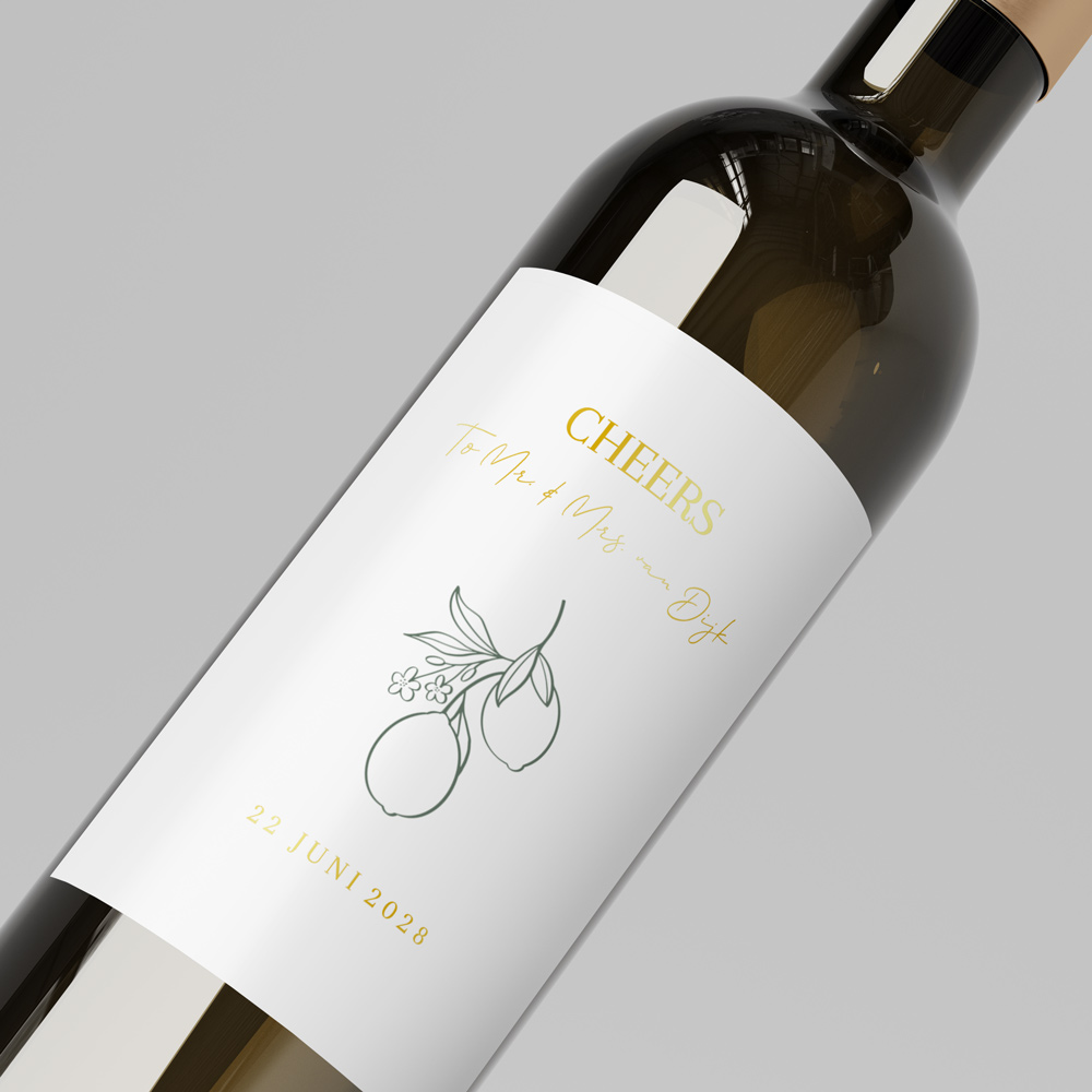 Wijnetiket voor op een fles als bedankje aan de gasten van jullie bruiloft. Formaat: staand 8x11 cm. Dit etiket hoort bij de trouwhuisstijl Italian vibes.• Ontwerp je eigen wijnetiket
