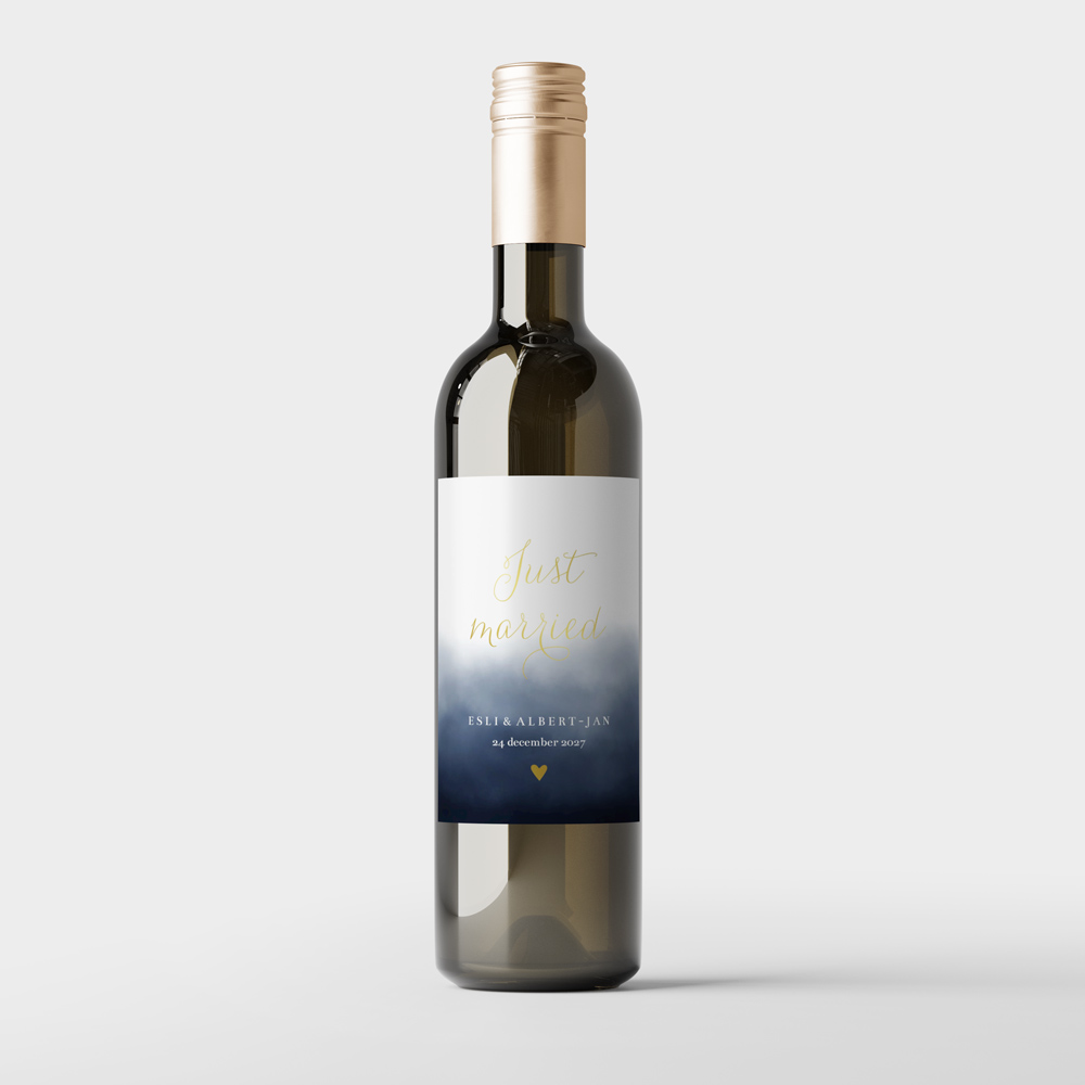Wijnetiket voor op een fles als bedankje aan de gasten van jullie bruiloft. Formaat: staand 8x11 cm. Dit etiket hoort bij de trouwhuisstijl Watercolor Blue.
