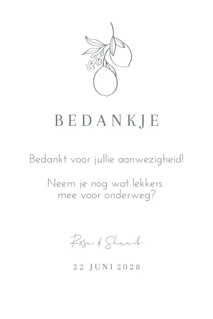 Ontwerp een kaart die je bij jullie bedankjes kunt neerzetten. Deze kaart is passend bij de trouwhuisstijl Italian vibes.| Totaalprijs: 0 |