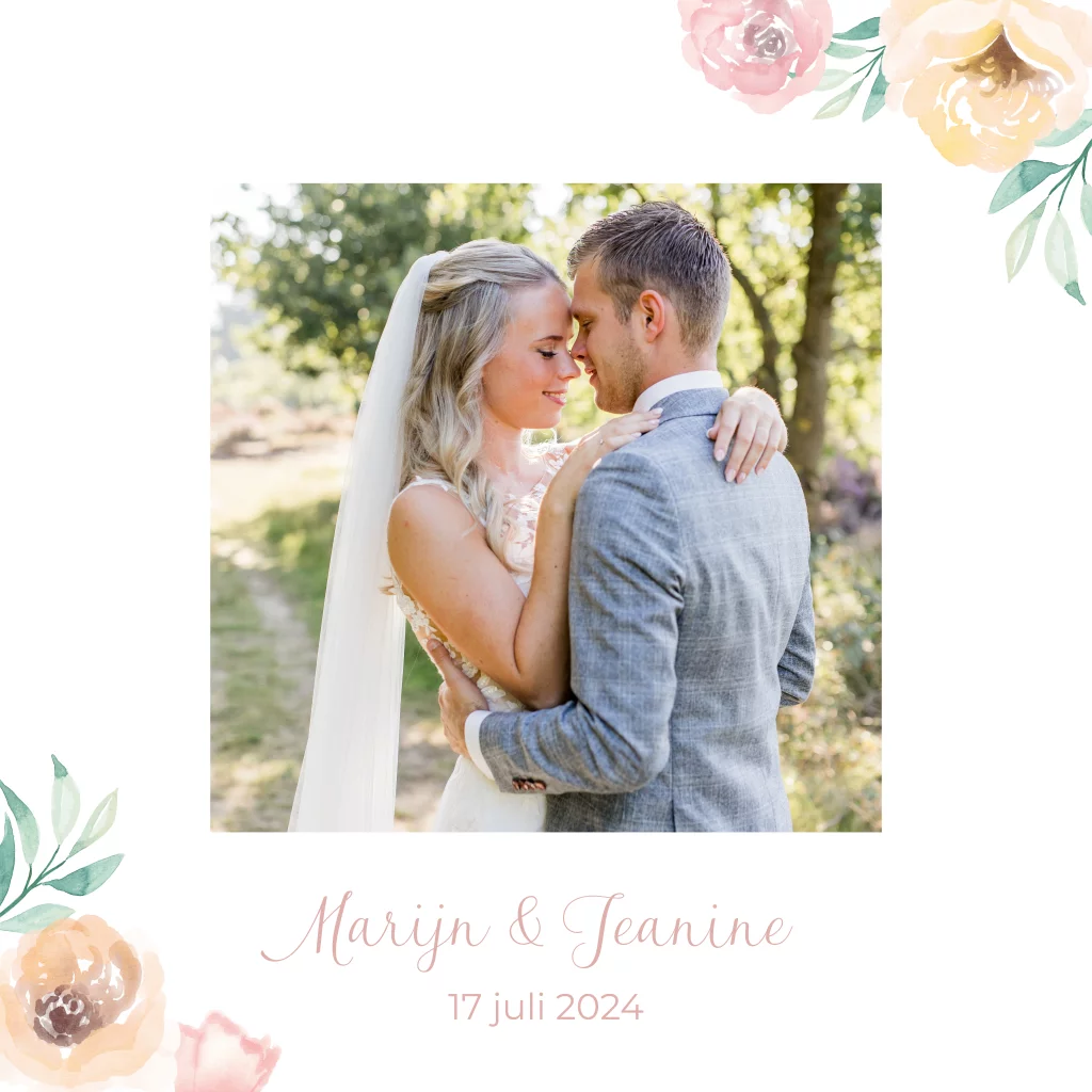 Romantische bedankkaart met bloemen en een foto. Vervang de foto gemakkelijk door een foto van jullie bruiloft! Fotografie: Jasmijn Brussé