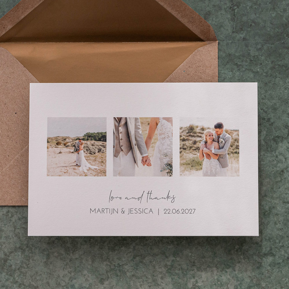 Wil je ook graag de mooiste foto's van jullie bruiloft delen? Stuur dan een bedankkaart aan alle gasten! Vervang de foto's uit de collage gemakkelijk door jullie mooiste foto's.