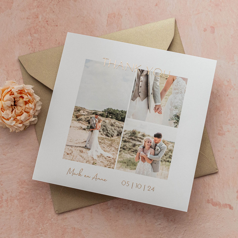 Verstuur een bedankkaart met de mooiste foto's van jullie bruiloft naar alle gasten! Vervang gemakkelijk de foto's door jullie favoriete trouwfoto's.