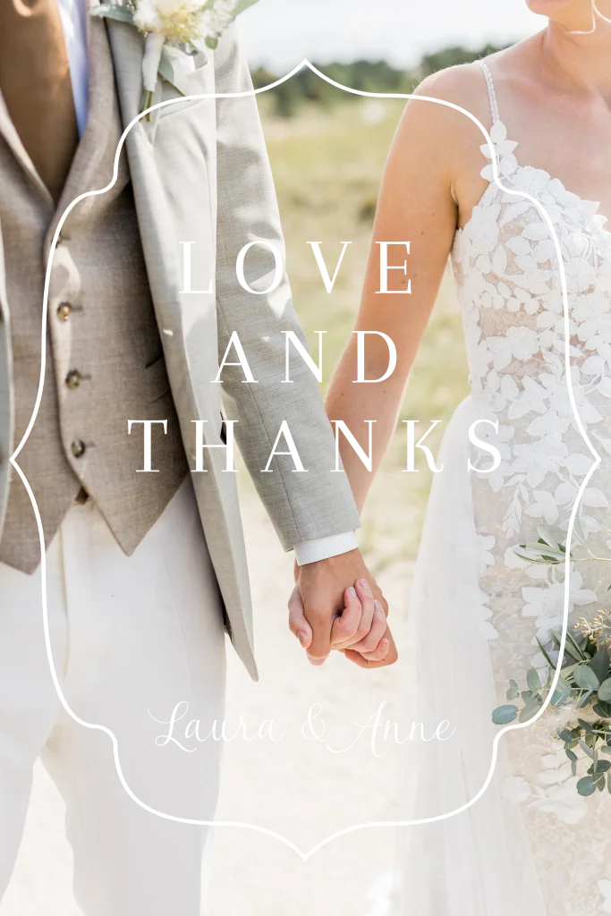 Moderne bedankkaart met een grote trouwfoto en golf lijn. Zo bedank je de gasten van jullie bruiloft in stijl met een foto van jullie mooiste dag!