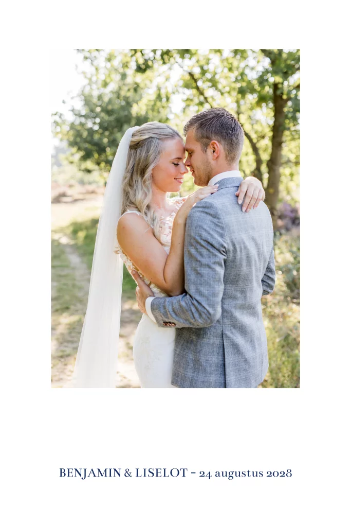 Klassieke bedankkaart kaart met donkerblauwe letters en goudfolie. Zo bedanken jullie de gasten van de bruiloft in stijl! Vervang de voorbeeldfoto door jullie eigen foto. Fotografie: Jasmijn Brussé| Totaalprijs: 0 |