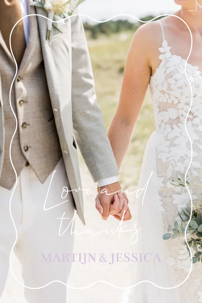 Moderne bedankkaart met een grote trouwfoto en golf lijn. Zo bedank je de gasten van jullie bruiloft in stijl met een foto van jullie mooiste dag! Fotografie: Jasmijn Brussé| Totaalprijs: 0 |