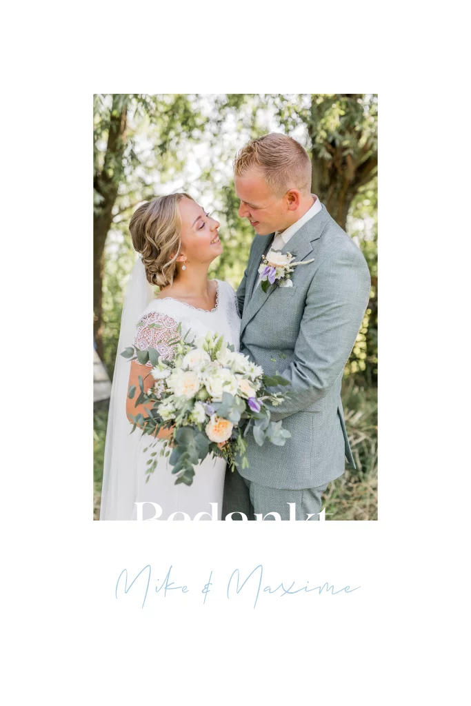 Wil je alle gasten van jullie bruiloft graag bedanken? Verstuur dan een bedankkaart met een foto van jullie trouwdag! Vervang de foto gemakkelijk door de favoriete foto van jullie mooiste dag.