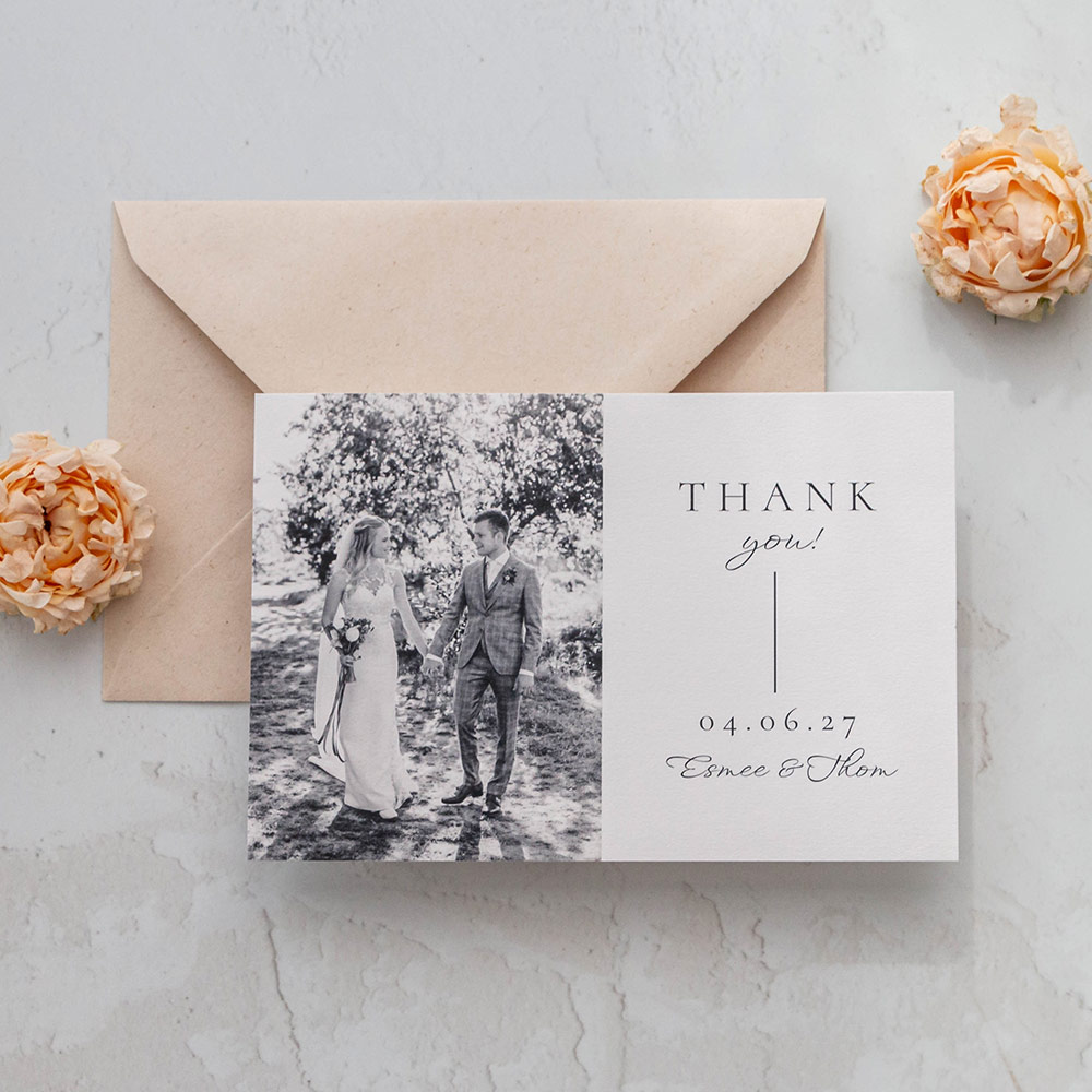 Moderne bedankkaart met een foto. Vervang de foto gemakkelijk door jullie favoriete trouwfoto. Zo bedank je de gasten van jullie bruiloft in stijl! Fotografie: Jasmijn Brussé