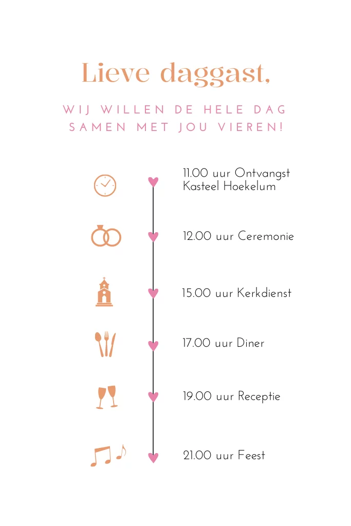 Een extra inlegkaartje met tijdlijn voor bij de trouwkaart in oranje en roze. Op dit kaartje kun je alle extra informatie kwijt voor jullie bruiloft. TIP: druk dit kaartje af op een formaat van 10x15 cm.