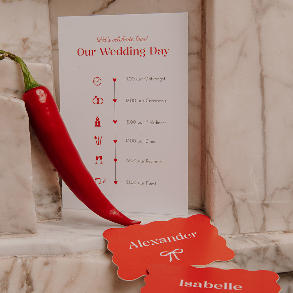 Een extra inlegkaartje met tijdlijn voor bij de trouwkaart met rode kleur. Op dit kaartje kun je alle extra informatie kwijt voor jullie bruiloft. TIP: druk dit kaartje af op een formaat van 10x15 cm. Fotografie: Biggy Tooth| Totaalprijs: 0 |
