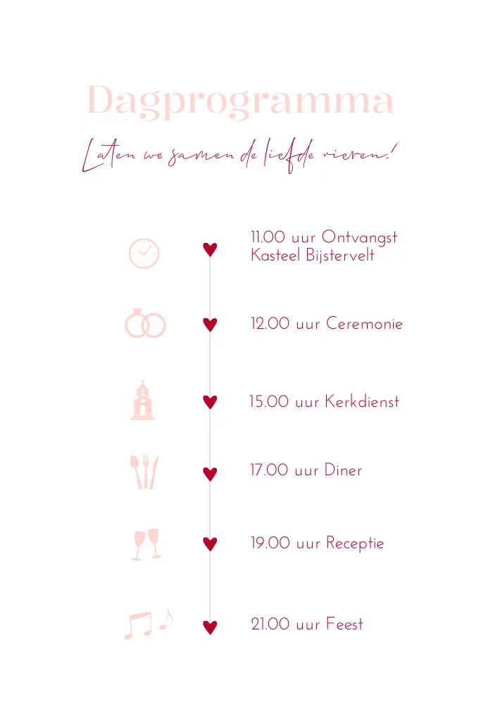 Een extra inlegkaartje met tijdlijn voor bij de trouwkaart in roze en rood. Op dit kaartje kun je alle extra informatie kwijt voor jullie bruiloft. TIP: druk dit kaartje af op een formaat van 10x15 cm.