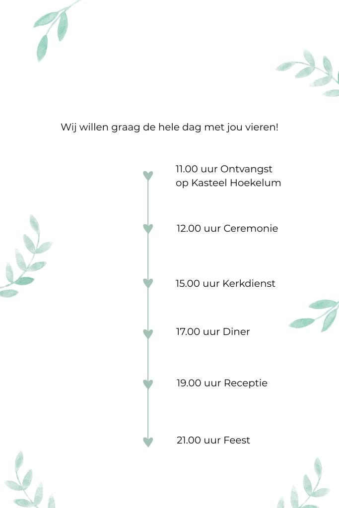 Kaartje met dagprogramma en tijdlijn voor bij jullie trouwkaart met rosefolie en takjes. Op dit kaartje kunnen de extra gegevens voor de daggasten staan. Voeg zelf icoontjes toe uit de beeldbank, zodat het helemaal past bij de planning van jullie bruiloft. TIP: druk dit kaartje af op een formaat van 10x15 cm.