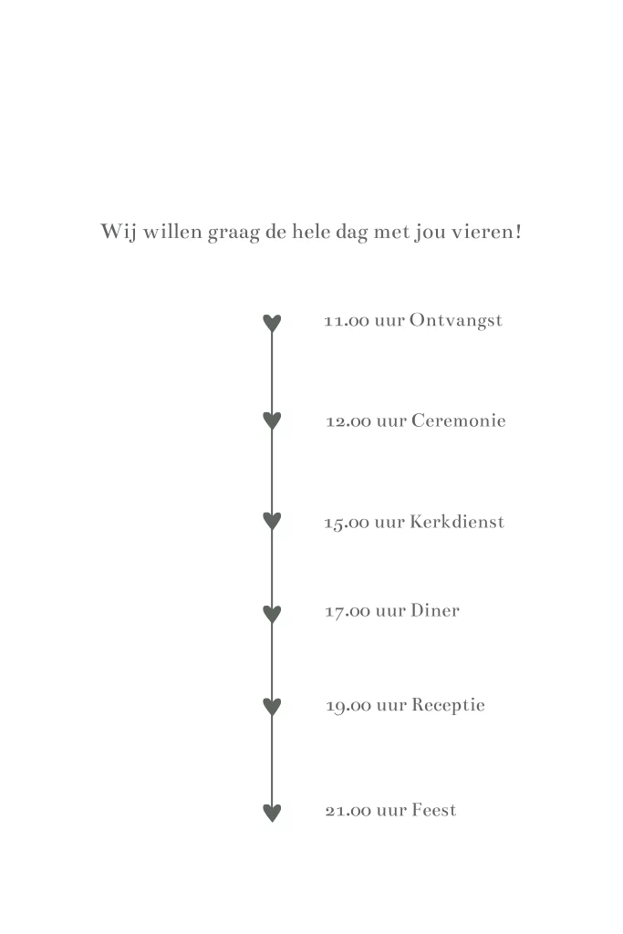Daggasten kaartje voor bij de trouwkaart met een tijdlijn van de hele bruiloft. Zo weten jullie gasten precies de planning van jullie dag, super handig! Pas het kaartje helemaal aan in de stijl van jullie trouwkaart.