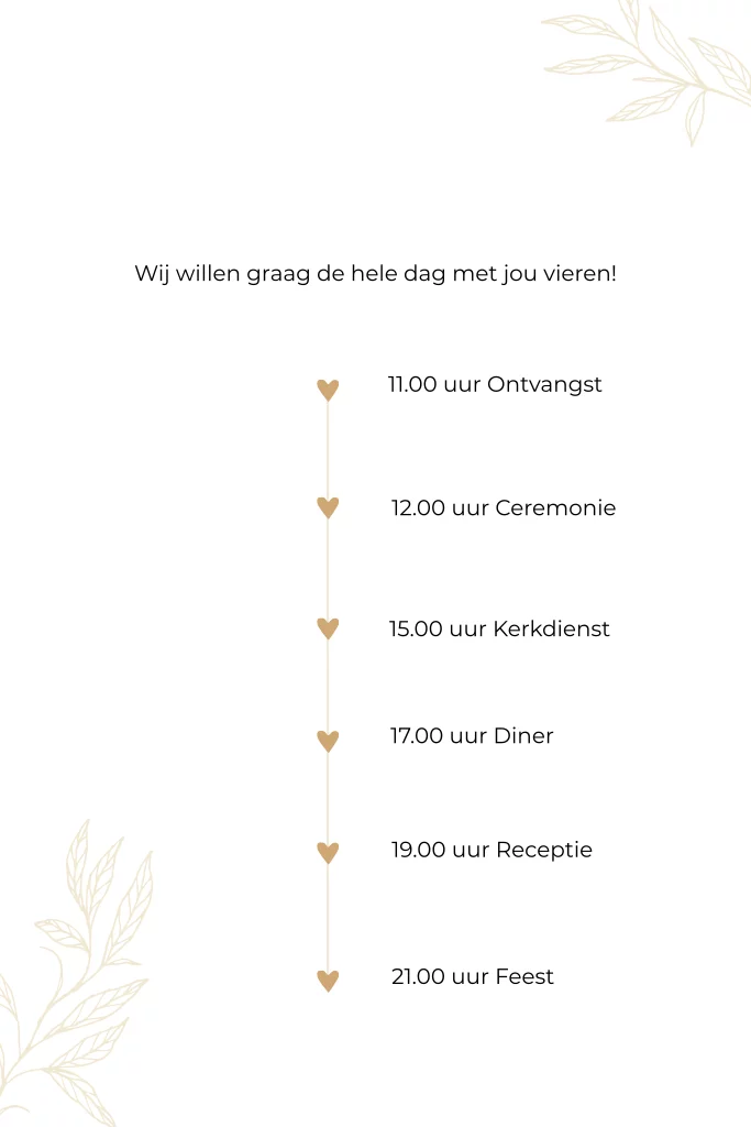 Dagprogramma kaartje met een tijdlijn voor bij de trouwkaart van de daggasten. Op dit kaartje kun je de hele planning voor jullie dag vermelden, zodat jullie gasten precies weten wat jullie gaan doen. Op de achterzijde is plaats voor extra details. TIP: druk dit kaartje af op een formaat van 10x15 cm.