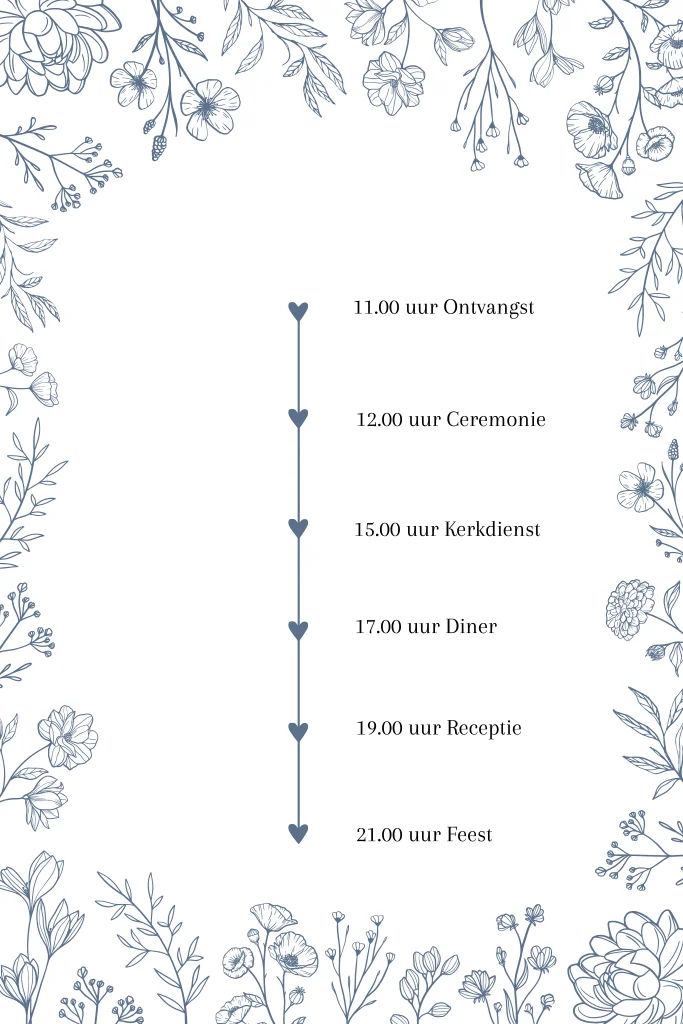 Dagprogramma kaartje met een tijdlijn voor bij de trouwkaart van de daggasten. Op dit kaartje kun je de hele planning voor jullie dag vermelden, zodat jullie gasten precies weten wat jullie gaan doen. Op de achterzijde is plaats voor extra details. TIP: druk dit kaartje af op een formaat van 10x15 cm.| Totaalprijs: 0 |