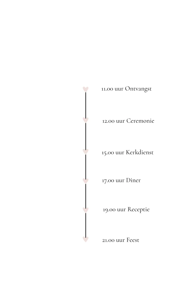 Dagprogramma kaartje met een tijdlijn voor bij de trouwkaart van de daggasten. Op dit kaartje kun je de hele planning voor jullie dag vermelden, zodat jullie gasten precies weten wat jullie gaan doen. Op de achterzijde is plaats voor extra details. TIP: druk dit kaartje af op een formaat van 10x15 cm.
