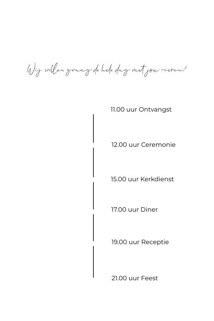 Dagprogramma kaartje met een tijdlijn voor op jullie bruiloft. Op dit kaartje kun je de hele planning voor jullie dag vermelden, zodat jullie gasten precies weten wat jullie gaan doen. Op de achterzijde is plaats voor extra details.