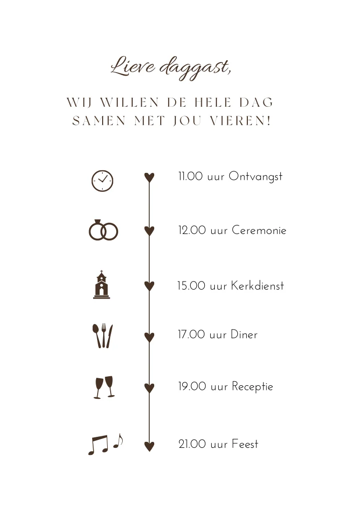 Details kaartje met dagprogramma en tijdlijn voor bij jullie trouwkaart! In dezelfde stijl als de uitnodiging kun je een extra inlegkaartje toevoegen met de planning van jullie bruiloft. Vul zelf de tijden in en voeg icoontjes toe uit de beeldbank.