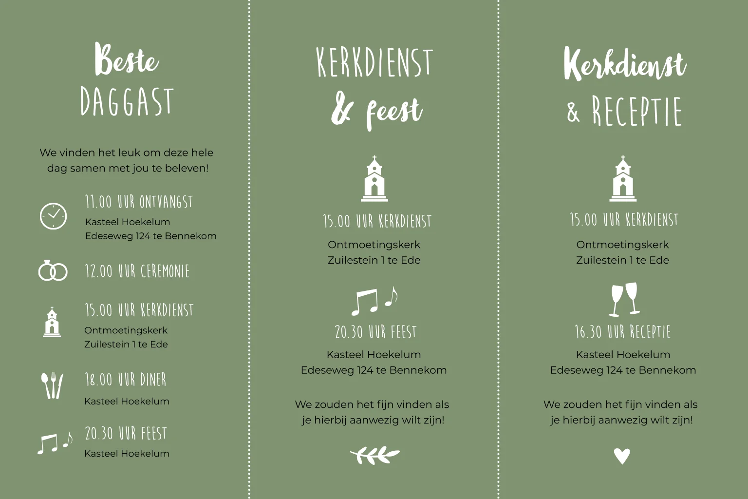 Zelf te maken labels met programma en tijdlijn voor de daggasten, receptiegasten of avondgasten op jullie bruiloft. Pas de labels volledig aan naar jullie wensen. Houd er rekening mee dat je deze labels zelf moet snijden of knippen. Bevestig ze eenvoudig met een bijpassend lintje, touwtje of paperclip aan de kaart. Druk deze kaartjes af op een kaart van 14x21 cm, waardoor je 3 labels van 14x7 cm krijgt. De snijlijnen aan de voorzijde zijn niet zichtbaar na het uitprinten, waardoor de labels er netjes uitzien in het uiteindelijke ontwerp.