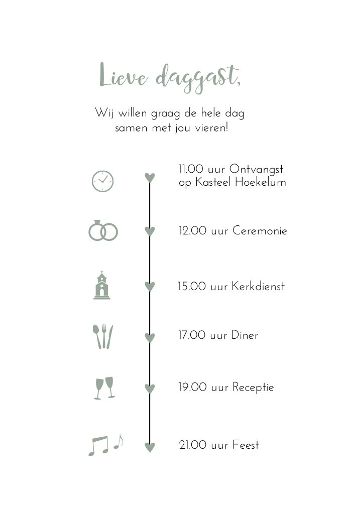 Trouwkaart dagprogramma modern groen tijdlijn icoontjes daggast