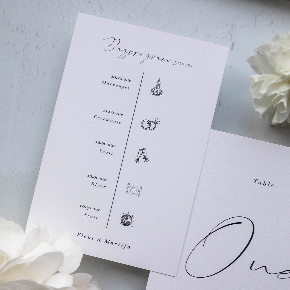 Een extra inlegkaartje met tijdlijn voor bij de trouwkaart in zwart en wit met getekende icoontjes. Op dit kaartje kun je alle extra informatie kwijt voor jullie bruiloft. TIP: druk dit kaartje af op een formaat van 10x15 cm.