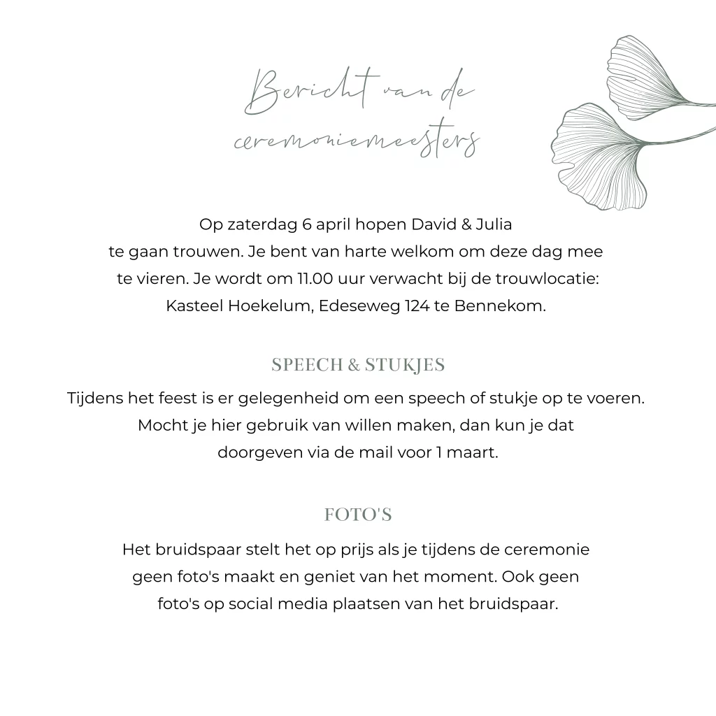 Met deze ceremoniemeester kaart in botanische stijl met ginkgo bladeren laten jullie specifieke details weten. Het kaartje pas je in de editor aan naar de stijl van jullie trouwkaart, zodat het een harmonieus geheel is.