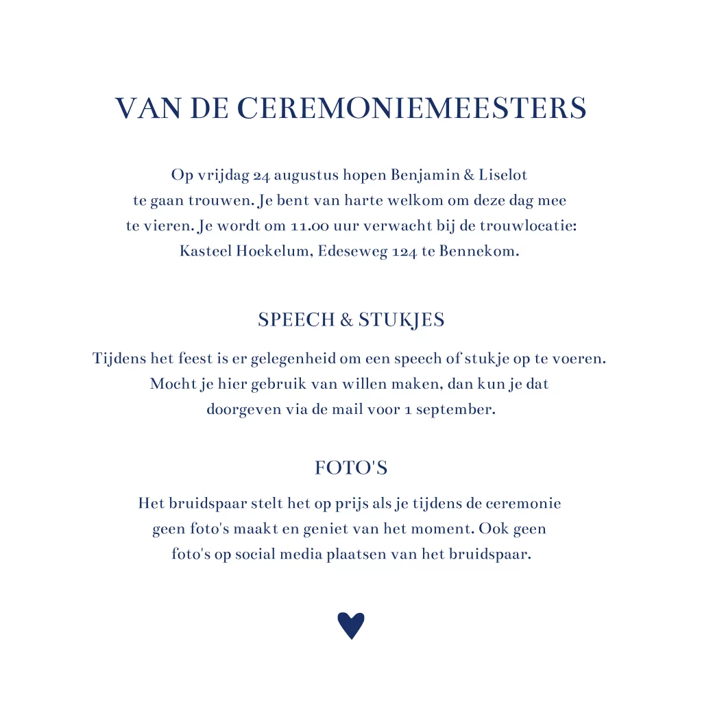 Ceremoniemeester kaart voor bij de trouwkaart met extra aanvullende informatie voor jullie bruiloft. Vul zelf de tekst in en pas de kleuren en lettertypes aan naar die van jullie trouwkaart.