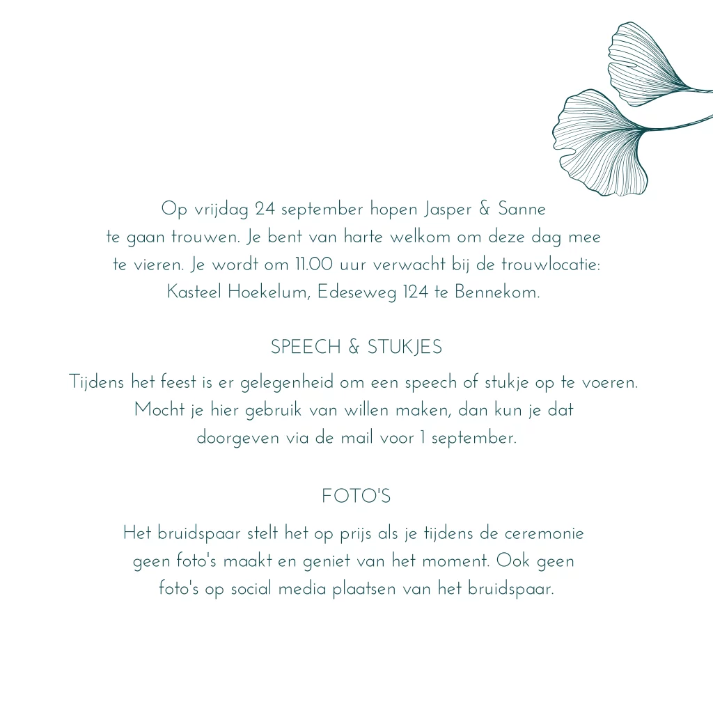 Met deze ceremoniemeester kaart in botanische stijl met rosefolie laten jullie specifieke details weten. Het kaartje pas je in de editor aan naar de stijl van jullie trouwkaart, zodat het een harmonieus geheel is.