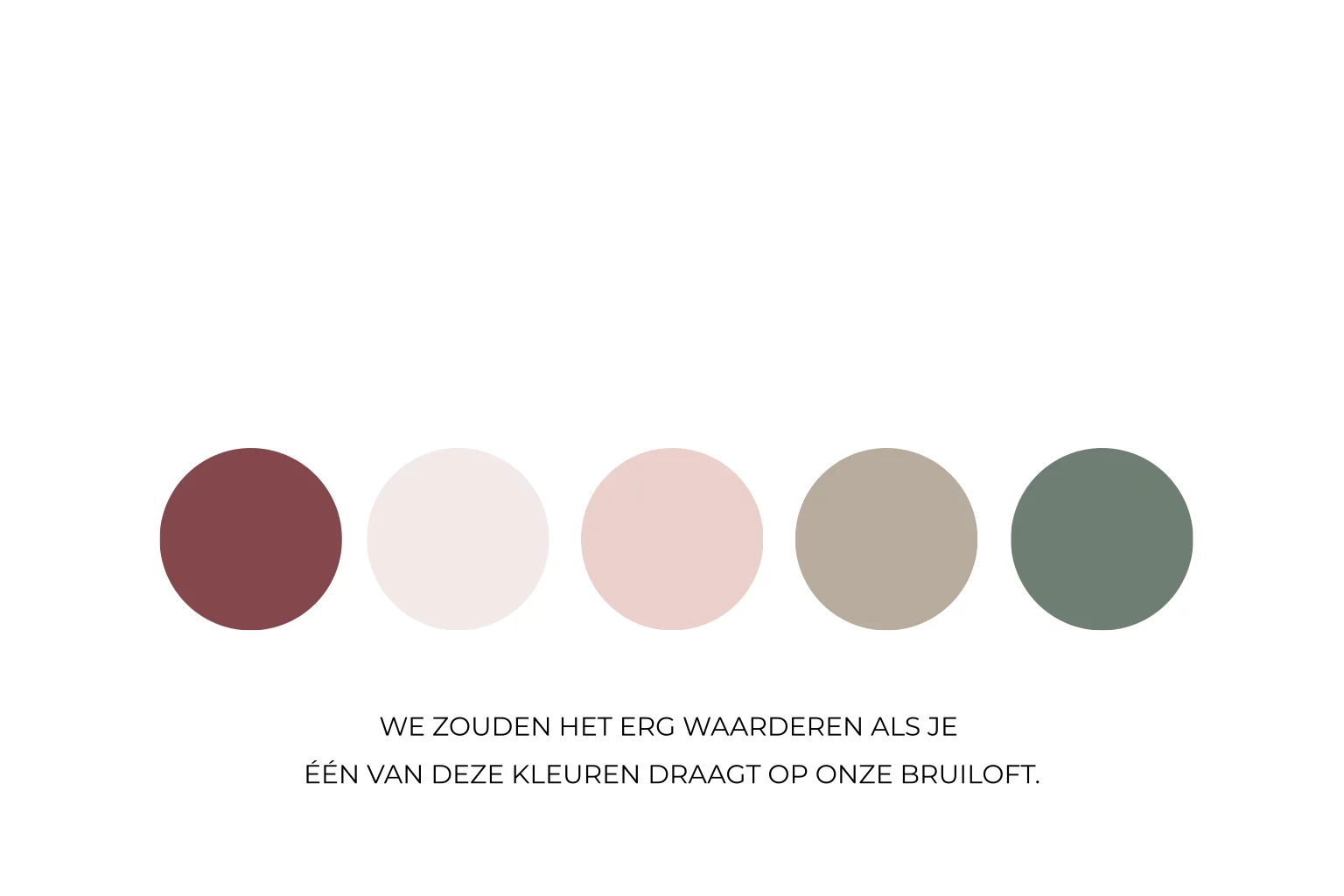 Voeg een klein dresscode kaartje toe aan jullie bruiloft met de kleuren die de gasten mogen dragen. Pas in de editor de kleuren aan naar de themakleuren van jullie bruiloft. Druk dit kleine kaartje af op een formaat van 8,1 × 5,4 cm.