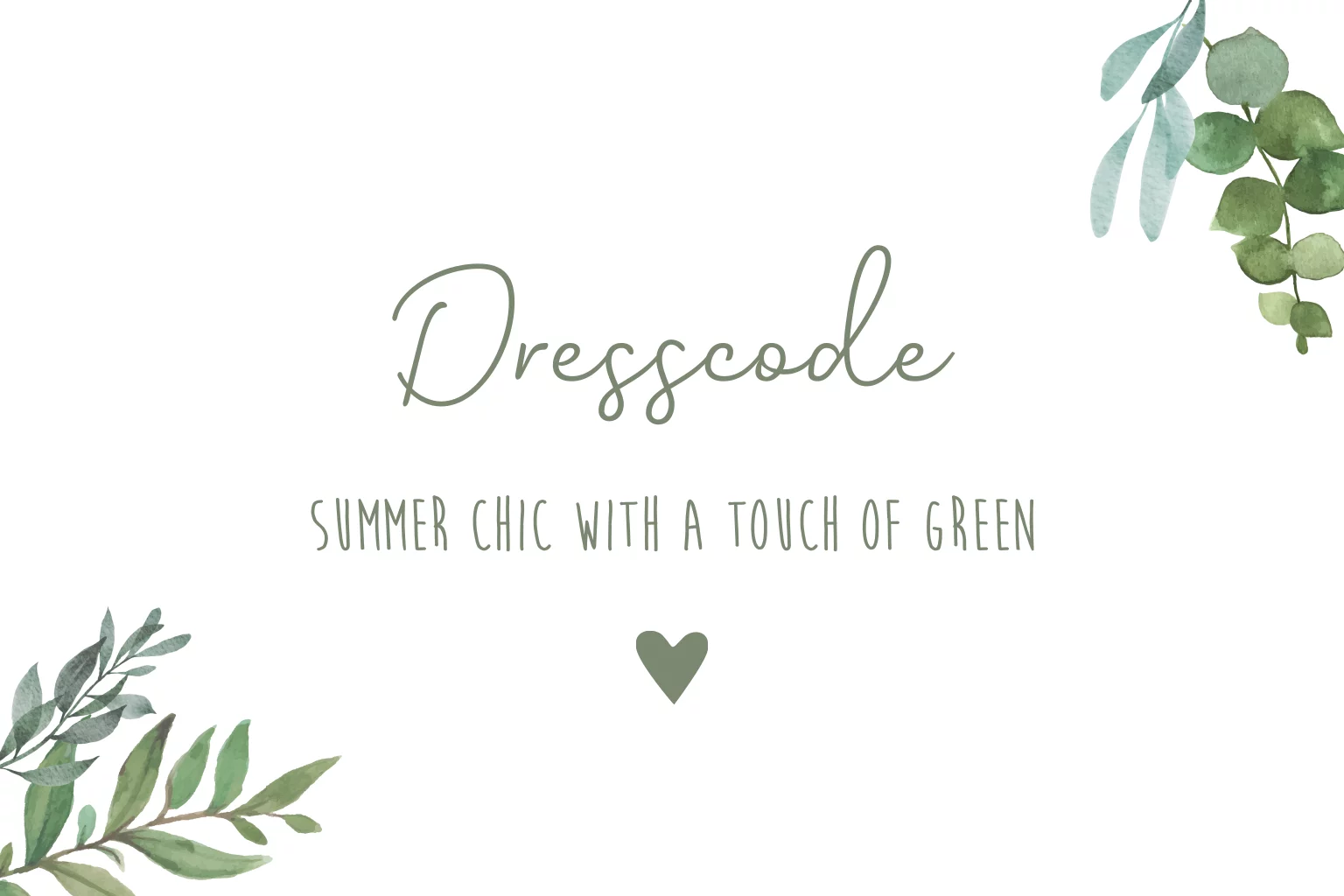 Dit dresscode kaartje met botanisch groene takjes en een hartje voeg je toe bij de trouwkaart. Met het kaartje vertel je de dresscode van jullie bruiloft. Pas het kaartje in de editor naar wens aan. Druk het kleine kaartje af op 8,1 × 5,4 cm.