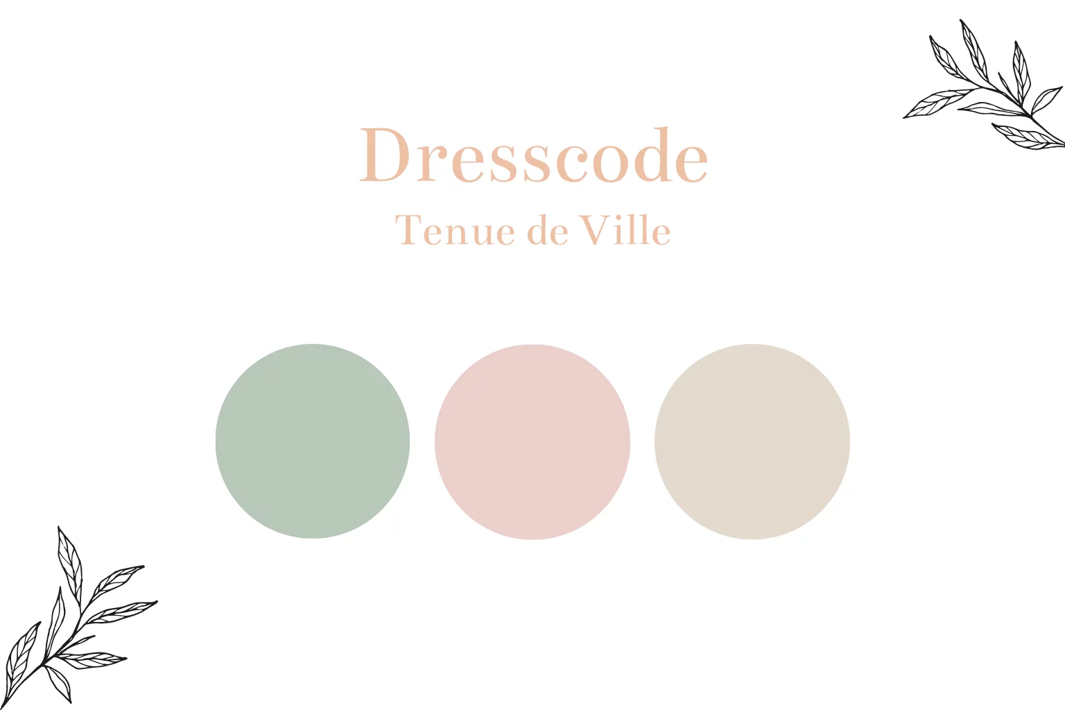 Dresscode kaartje met kleuren rondjes voor bij de trouwkaart. Pas in de editor de kleuren aan naar de themakleuren van jullie bruiloft. Druk dit kleine kaartje af op een formaat van 8,1 × 5,4 cm. Dit kaartje is passend bij de trouwhuisstijl Classic leaves.