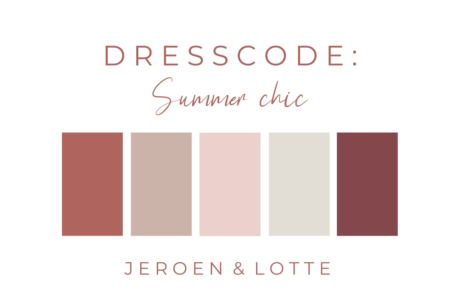 Modern dresscode kaartje in rode, roze en beige kleuren voor bij de trouwkaart. Zo laat je de gasten het kleurenschema van jullie bruiloft weten een kunnen ze hier rekening mee houden in hun kledingkeuze. Druk dit kleine kaartje af op een formaat van 8,1 × 5,4 cm.