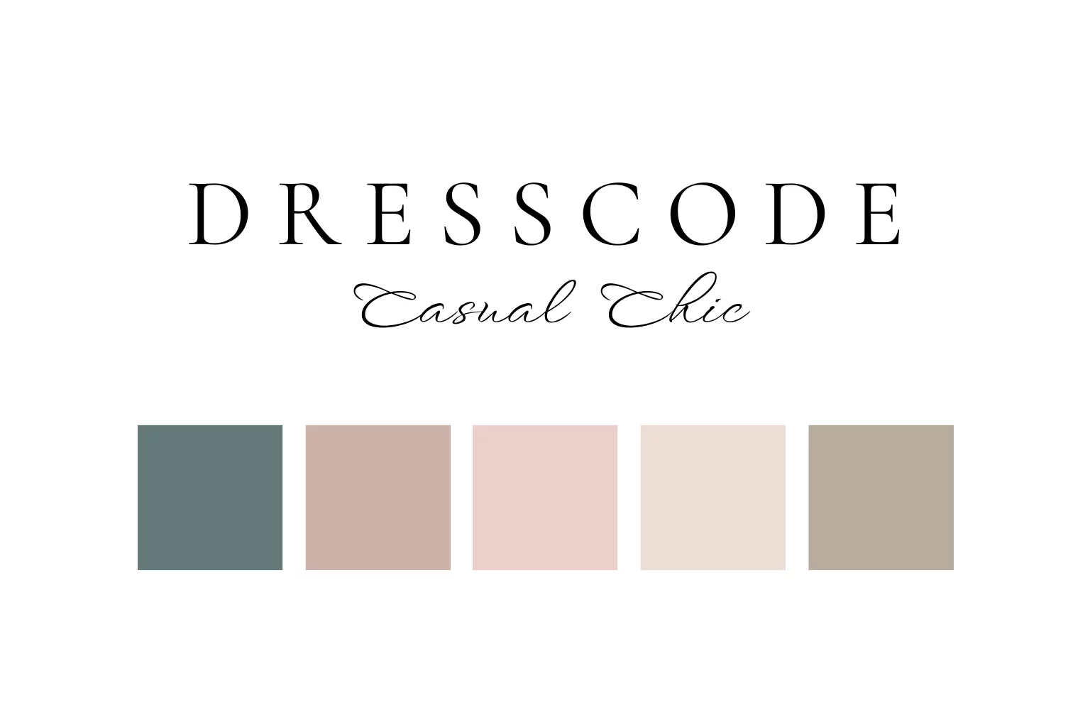 Dresscode kaartje voor bij jullie trouwkaart. De gekleurde vierkantjes kun je zelf een kleur geven van jullie themakleuren voor de bruiloft. Druk dit kleine kaartje af op een formaat van 8,1 × 5,4 cm.