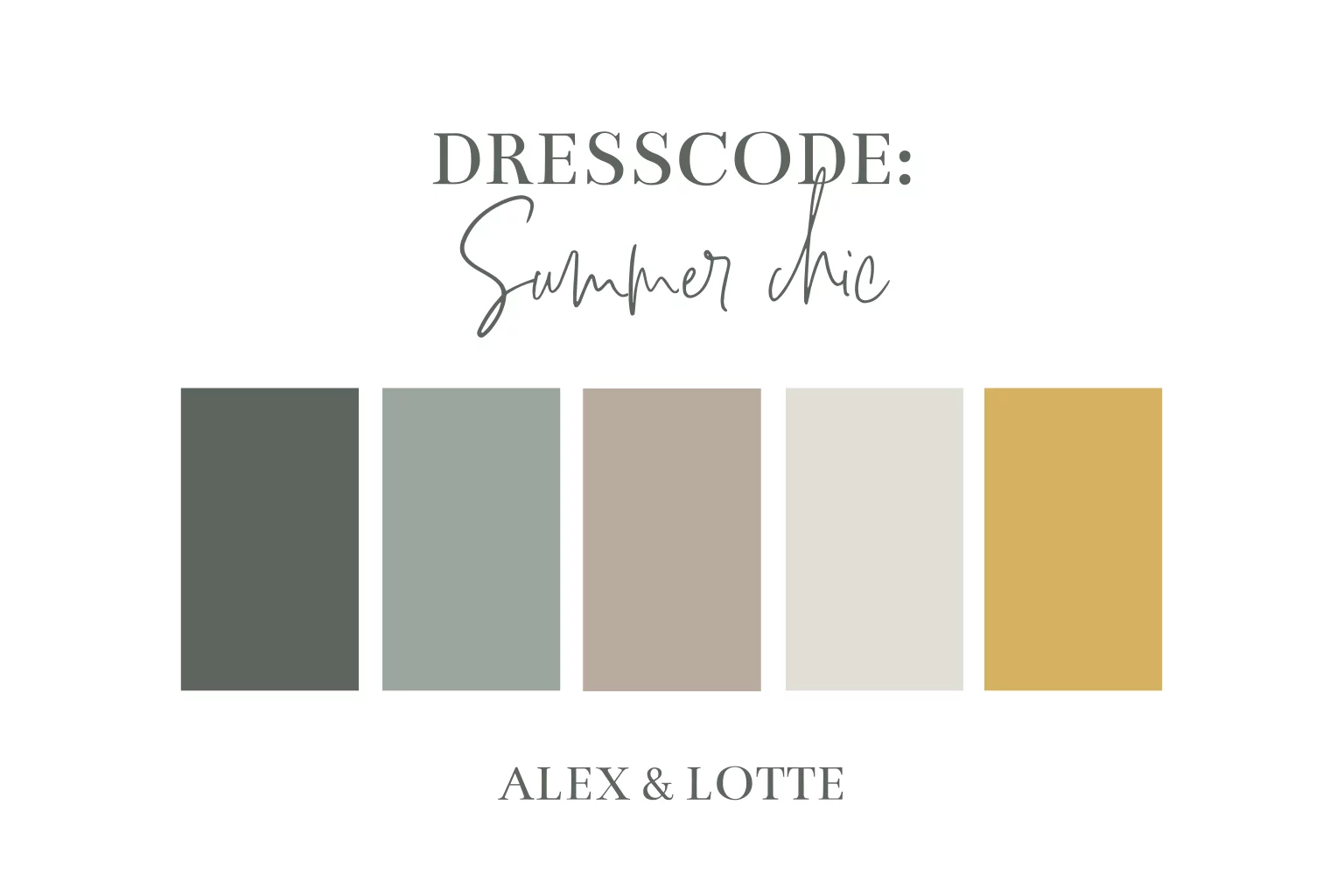 Modern dresscode kaartje in groene en beige kleuren voor bij de trouwkaart. Pas de kleuren zelf naar wens aan in de editor voor jullie eigen bruiloft. Druk dit kleine kaartje af op een formaat van 8,1 × 5,4 cm.
