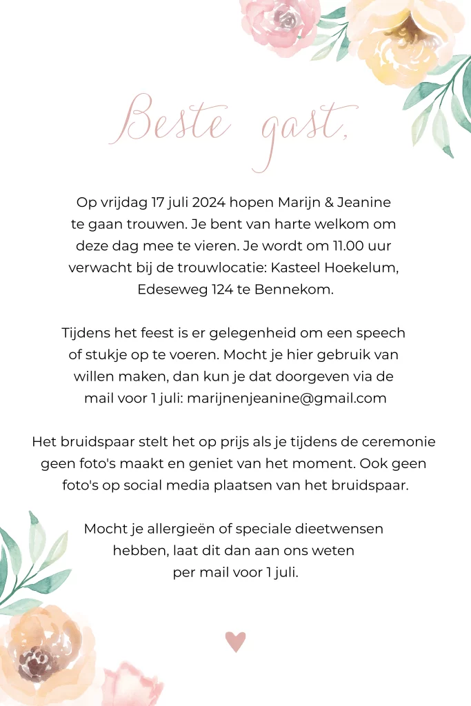 Een ceremoniemeester kaart is een extra kaartje voor details over de bruiloft. Deze kaart is versierd met bloemen en goudfolie. Pas de kaart in de editor aan in de stijl van jullie trouwkaart voor een mooi harmonieuze stijl.