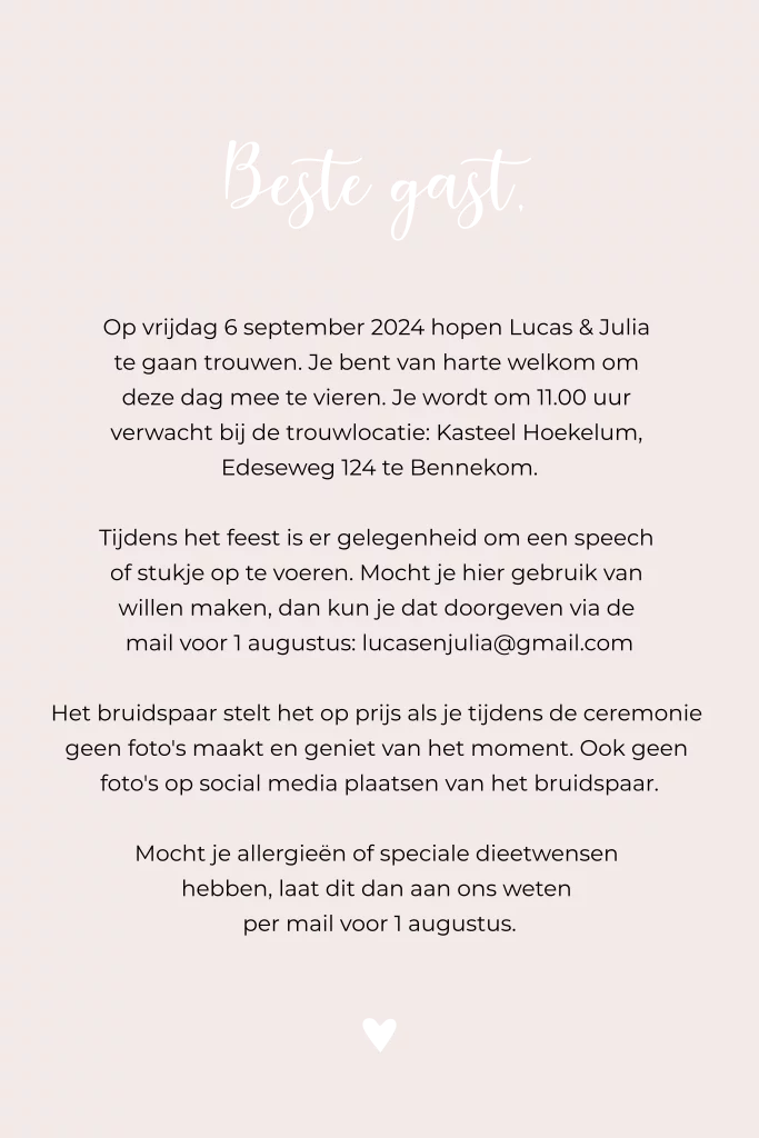 Plaats op dit extra detailkaartje voor bij de trouwkaart informatie van de ceremoniemeester. Het kaartje heeft goudfolie letters en een hartje. Pas het nog naar wens aan.