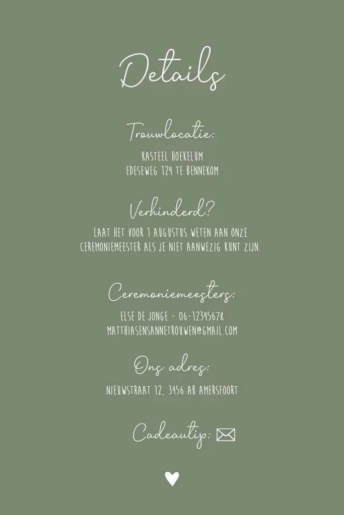 Extra detail kaartje voor bij de trouwkaart met aanvullende informatie. Pas het kaartje helemaal aan in de stijl van jullie trouwkaart.