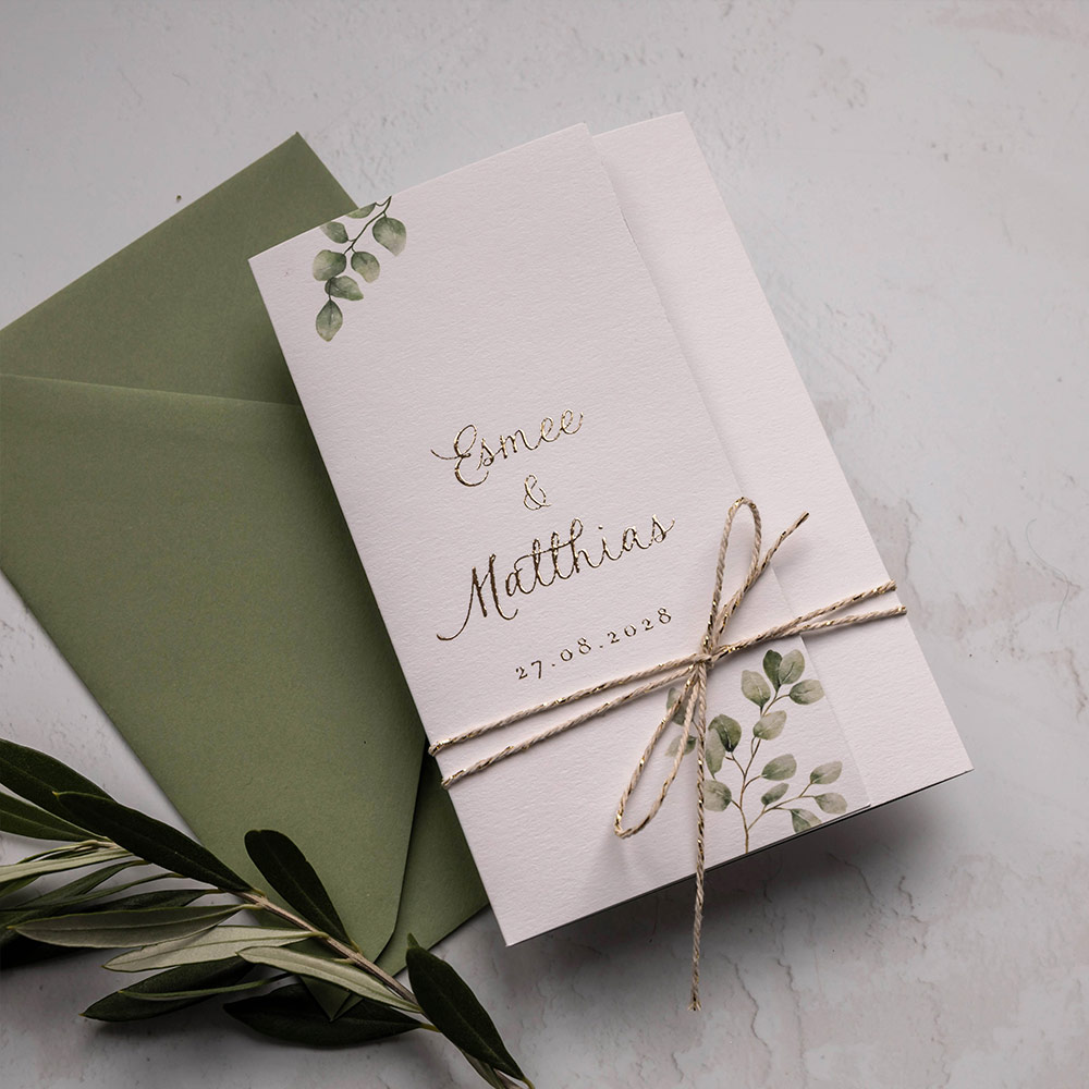 Trouwkaart drieluik mapje eucalyptus goudfolie