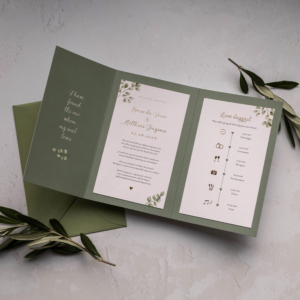 Trouwkaart drieluik mapje kaartenset eucalyptus