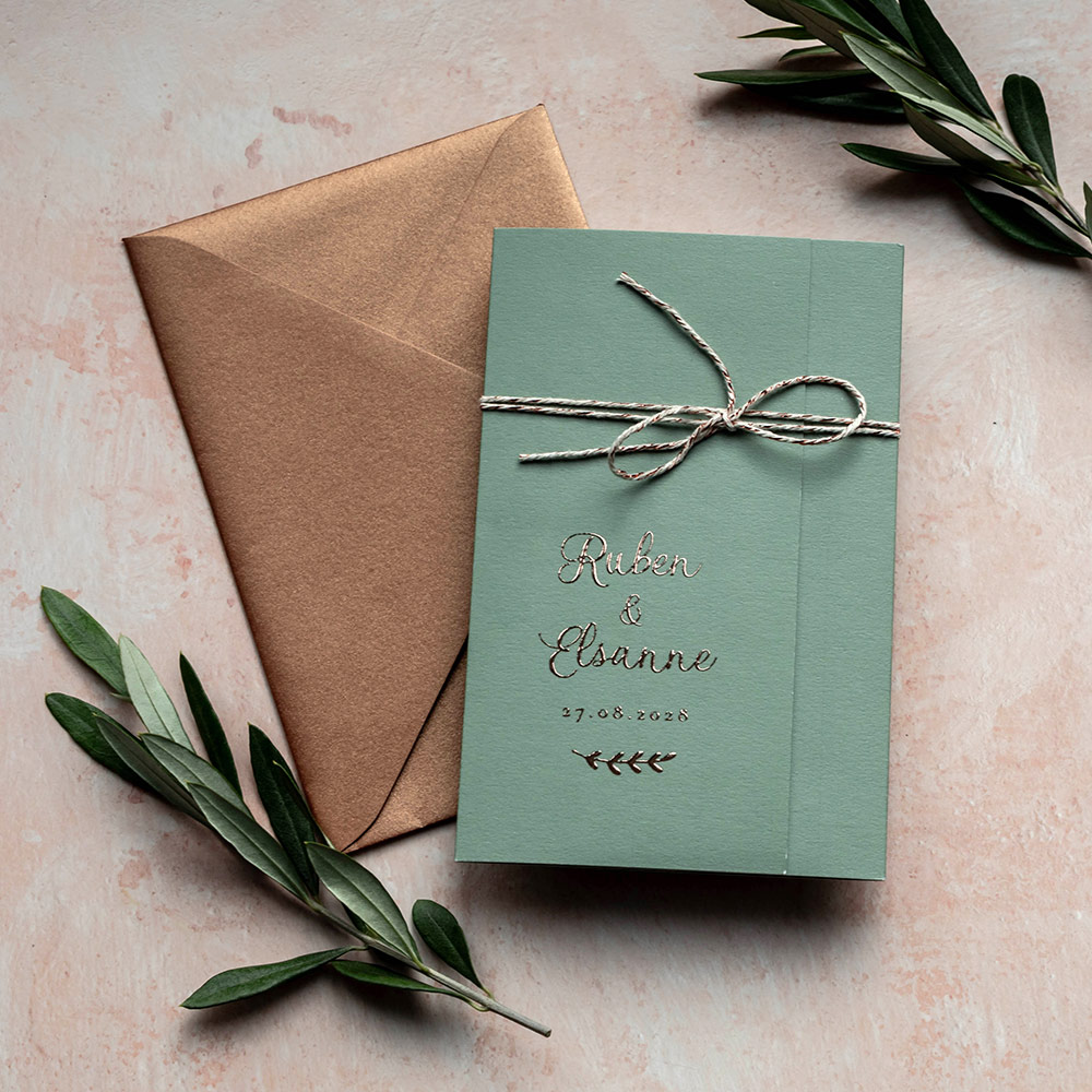 Trouwkaart drieluik mapje olijfgroen rosefolie