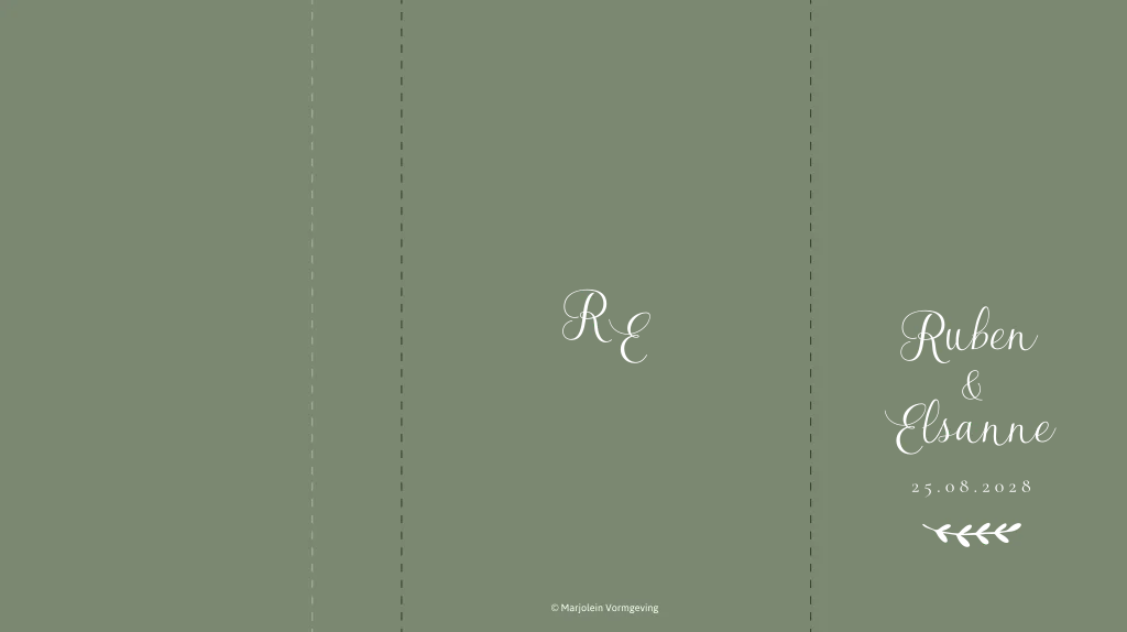 Trouwkaart drieluik mapje met rosefolie letters en olijfgroene achtergrond. Het drieluik mapje heeft een formaat van 17x11 cm als je het mapje dichtvouwt, met ongelijke zijdes. Je kunt alle zijdes bewerken in de editor. Met een mooi lint of touwtje kun je het drieluik mapje dichtmaken.