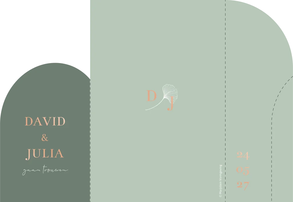 Trouwkaart mapje met boogdeurtjes in het groen met rosefolie. Het mapje heeft een formaat van 12x18 cm. Kies voor een envelop van 13,5x20 cm om de kaart in te versturen. Deze kaart kun je bijvoorbeeld gebruiken voor de feestgasten. De daggasten stuur je dan een uitgebreidere versie van de kaart met het insteekmapje met gleuf en de insteekkaart. Bekijk hier de uitgebreide versie: https://studiomarjoleinvormgeving.nl/trouwkaarten/insteekhoesjes/insteekmapje-trouwkaart-groen-rosefolie