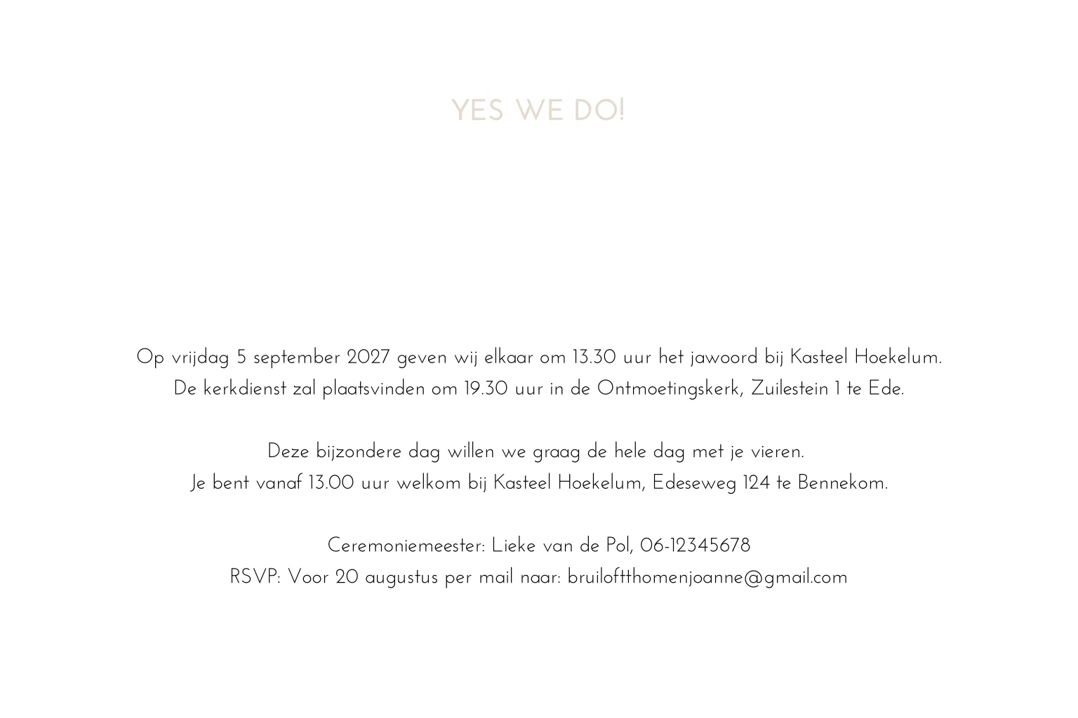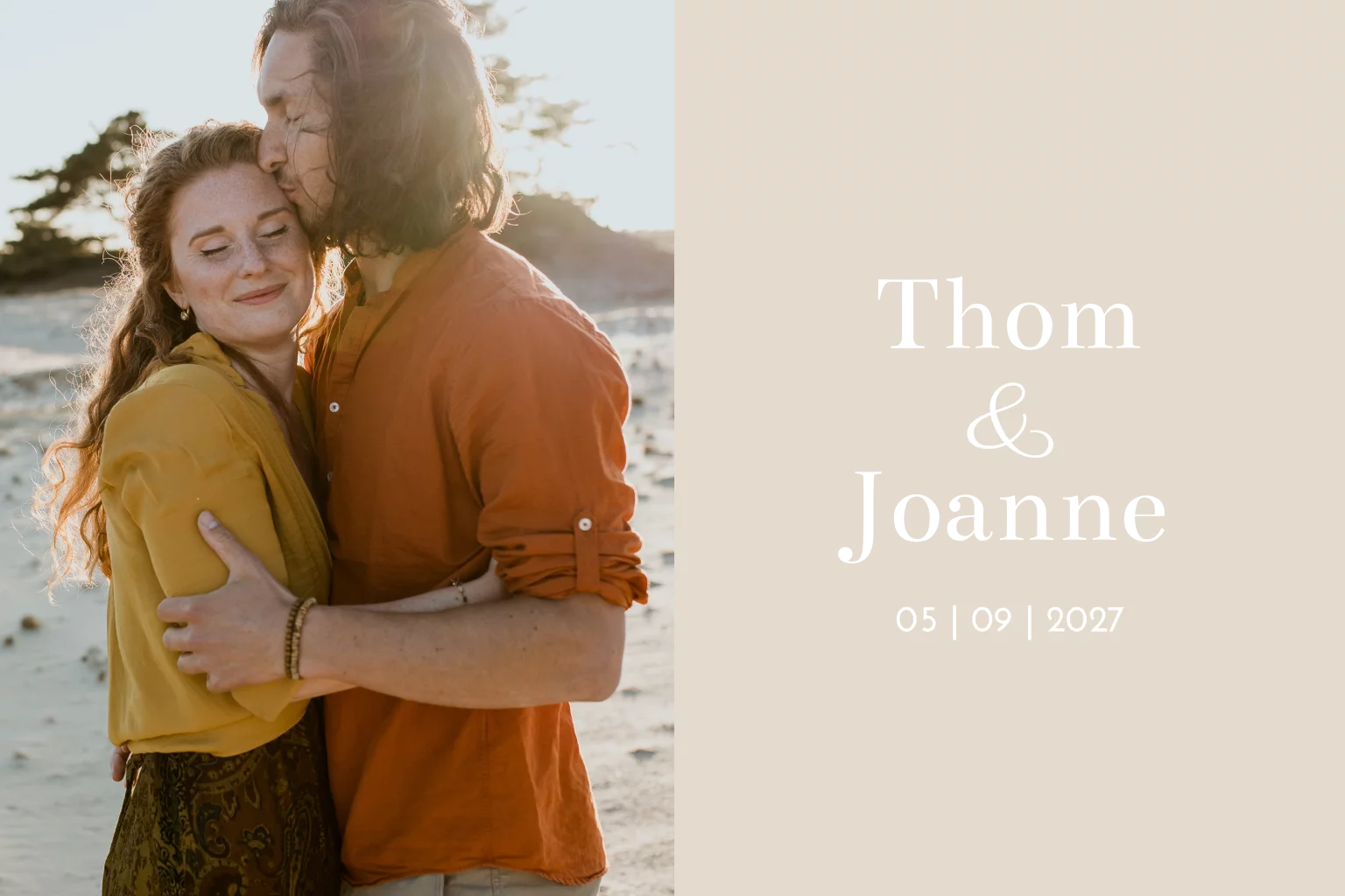 Een persoonlijke trouwkaart maak je met een mooie foto van jullie samen! Deze kaart heeft een beige achtergrond en is afgewerkt met goudfolie. De kleur van de trouwkaart en de folie kun je helemaal naar wens aanpassen. Fotografie: Day of my Life - www.dayofmylife.nl