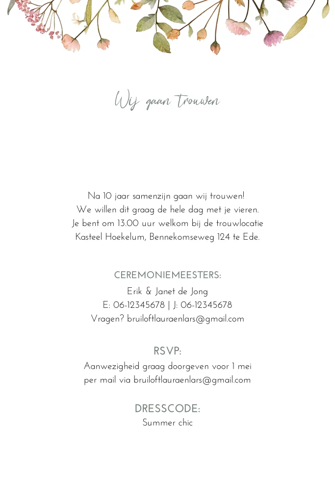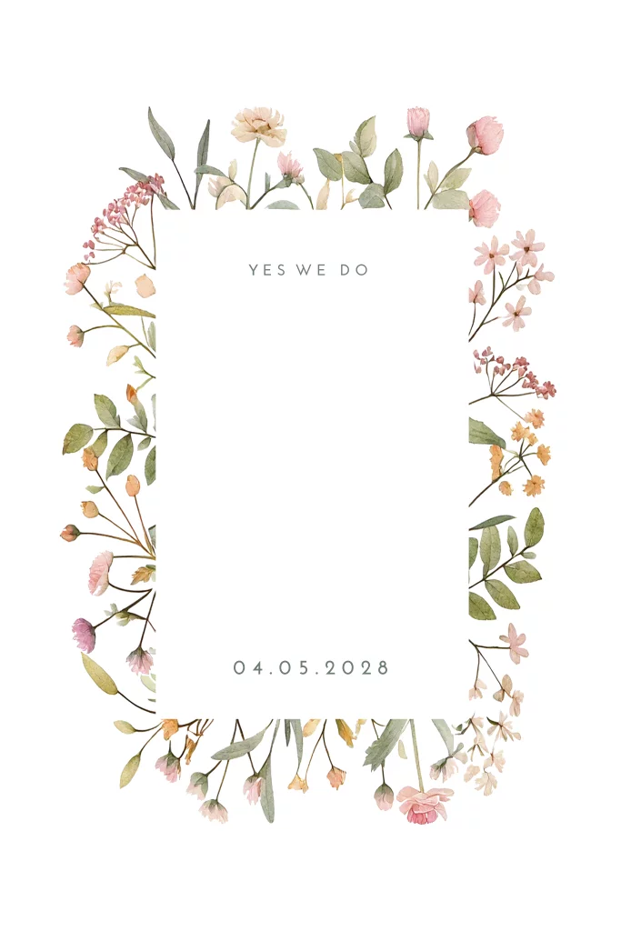 Trouwkaart met een rand van pastel gekleurde watercolor bloemen: perfect voor een romantische bruiloft! Pas de kleur van de folie nog naar wens aan. Aan de binnenzijde staat een programma voor dag, die je nog helemaal kunt aanpassen naar jullie eigen bruiloft met icoontjes uit de beeldbank.Totaalprijs: 0 |