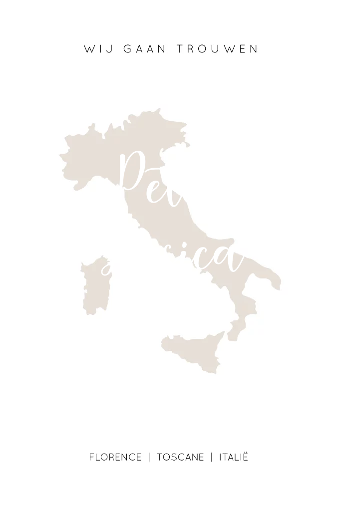 Trouwen jullie in Italië? Dan past deze stijlvolle trouwkaart met de kaart van Italië en goudfolie prachtig bij jullie Italiaanse bruiloft! Pas de kleuren van de kaart en de folie nog naar wens aan in de editor.