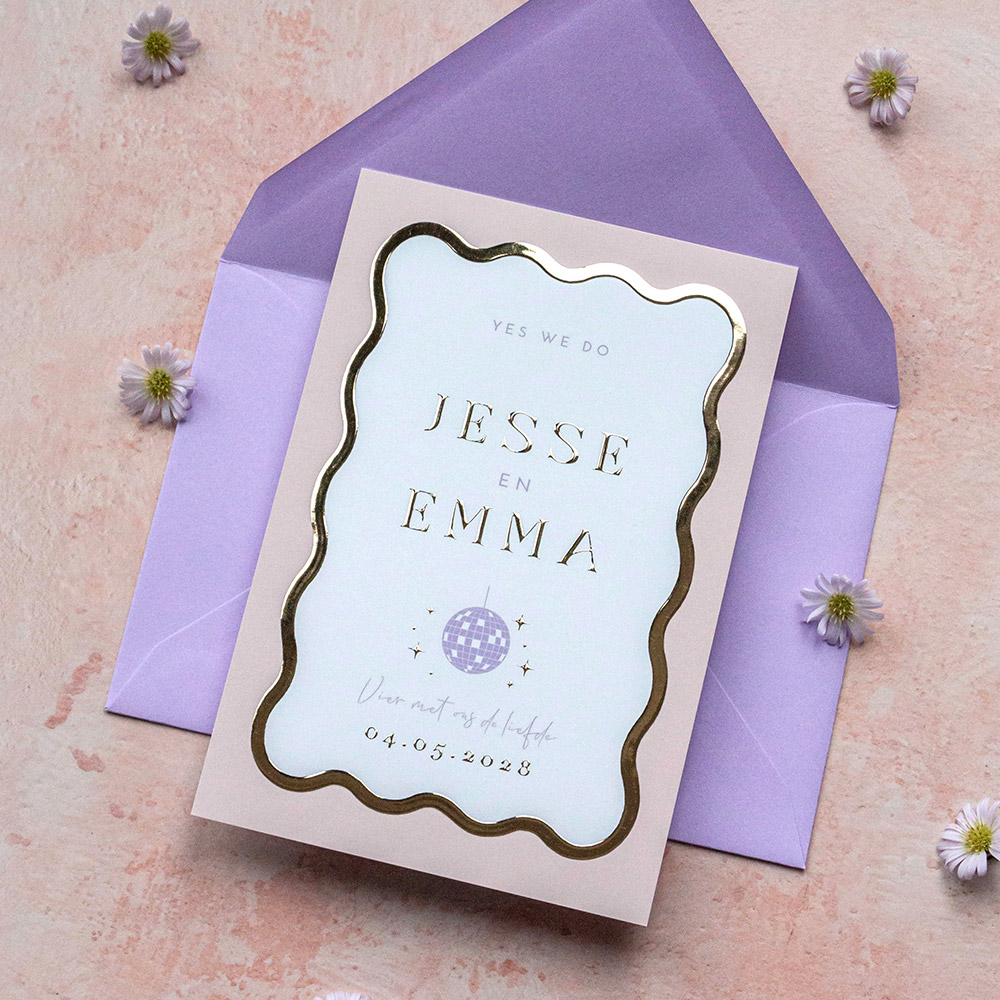 Yes, jullie gaan trouwen! De trouwkaart is de uitnodiging voor jullie feestje en deze moderne trouwkaart met golf vorm en discobal past daar perfect bij! De trouwkaart heeft lichtroze, lila en gouden kleuren. Pas de kleuren van de uitnodiging nog naar wens aan.