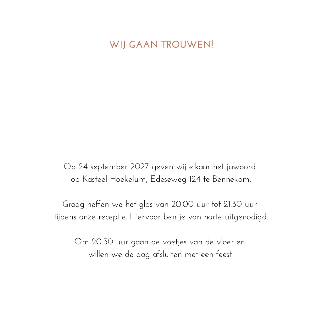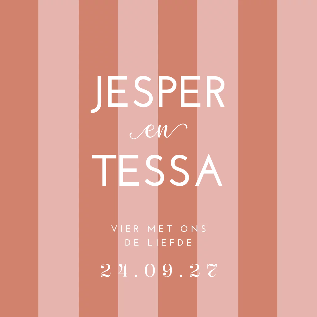 Geen standaard trouwkaart voor jullie? Deze moderne en kleurrijke trouwkaart met strepen in terracotta kleuren past dan perfect bij jullie bruiloft! De kaart is afgewerkt met goudfolie en aan de binnenzijde is plaats voor alle informatie.
